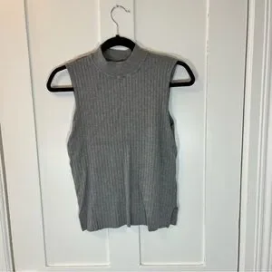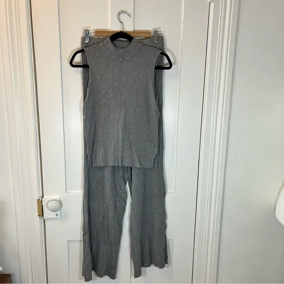 Stylish gray ribbed pants with a wide-leg design and a matching tank.