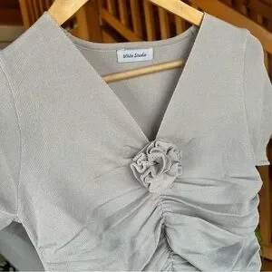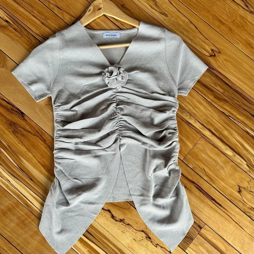 Elevate your style with this elegant gray ruched top. Perfect for any occasion, it offers a flattering fit and chic design. Size XS.