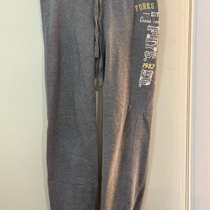Comfortable gray sweatpants with a sporty design. Features a printed logo on the side. Casual gray sweatpants with a printed Phys Ed design. Perfect for lounging or workouts.
