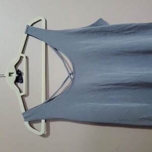 This is a stylish and comfortable blue/gray tank top, perfect for warm weather. Its simple design and versatile color make it a great addition to any casual wardrobe. The criss-cross strap detail on the front adds a touch of flair.