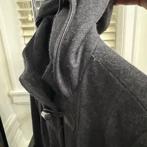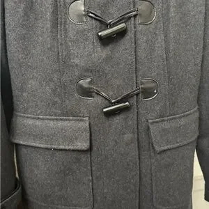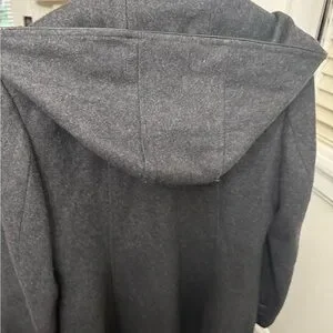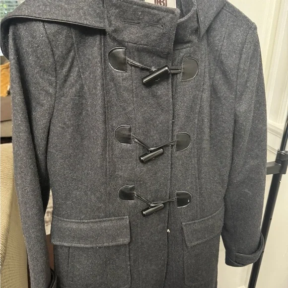 Stylish gray toggle coat with a hood. Features front pockets and a classic design.