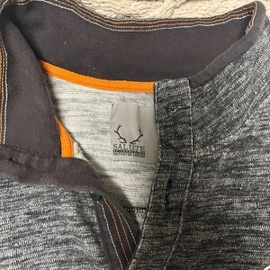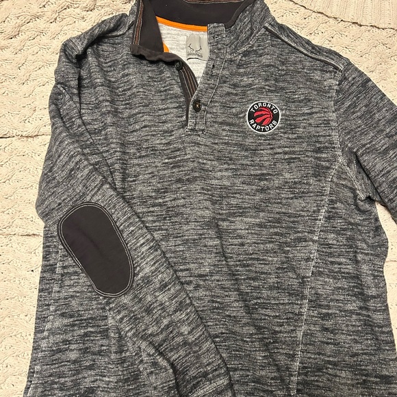 Stylish gray pullover with Toronto Raptors logo. Features elbow patches and a quarter-zip design.