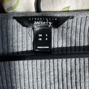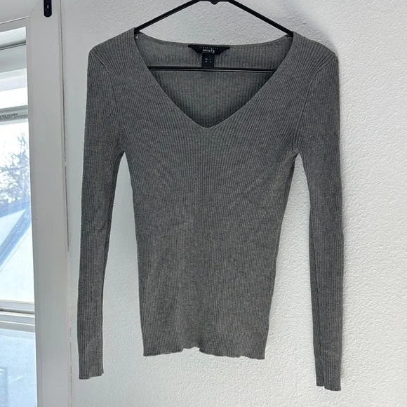 Stylish gray ribbed sweater with a flattering V-neck design. Perfect for layering or wearing alone.