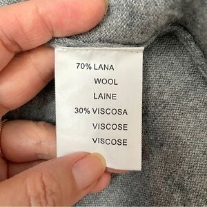 70% Wool / 30% Viscose, knee length, knit vest that ties in the middle. Ruffle detail all around the edge, very feminine!