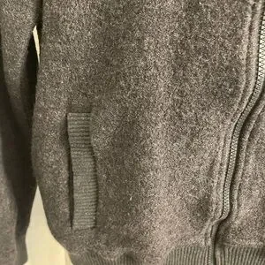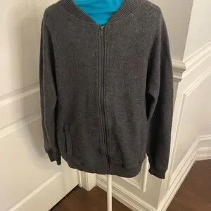 Cozy gray zip-up sweater with ribbed cuffs and hem. Perfect for layering. Wool, dry clean. Good used condition
