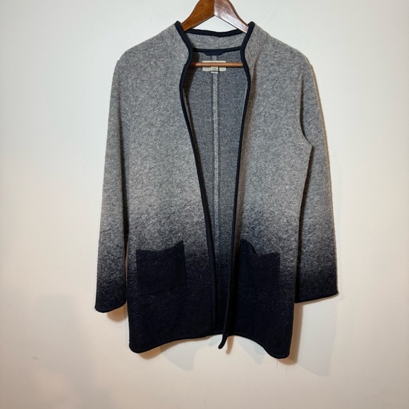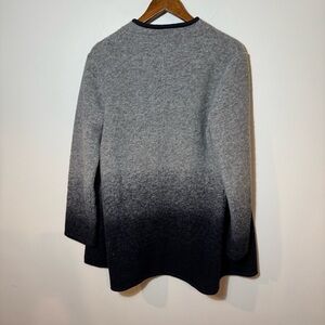 This stylish cardigan features a striking ombre effect, transitioning from light gray to black, and is designed with a full-length zipper for easy wear. The stand-up collar adds a touch of sophistication, while the wool blend material offers warmth and comfort. Perfect for layering, this hip-length cardigan is a versatile addition to any wardrobe.