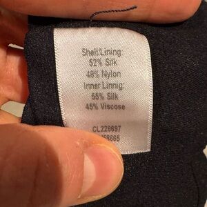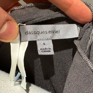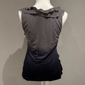 Elegant gray and black ruffled top for women. Perfect for any occasion. Newly dry cleaned - refer to photo. Pit-to-pit measurement is 16” but this garment is VERY stretchy. Beautiful silk blend - refer to photo for fabric composition.