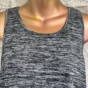 Elevate your casual wardrobe with this stylish gray sleeveless knit top. The fabric has a heathered pattern. The back has fold over opening.