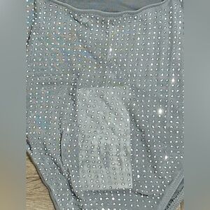 This sleek one-piece bodysuit features a ribbed texture in a versatile gray color, offering a form-fitting silhouette with a high crew neckline and sleeveless design.low back