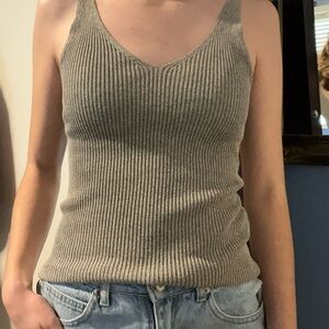 Stylish gray knit sleeveless top with a V-neck. Perfect for layering or wearing alone.