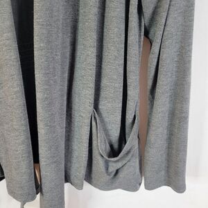 Stylish gray open front cardigan. Features draped design and front pockets. Perfect for layering. Size 16