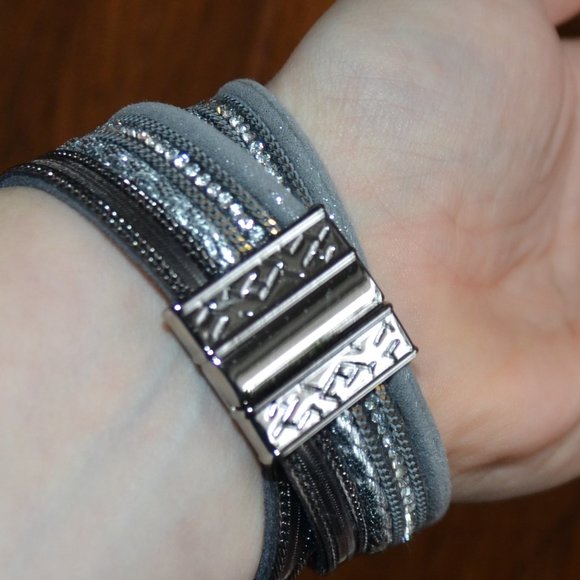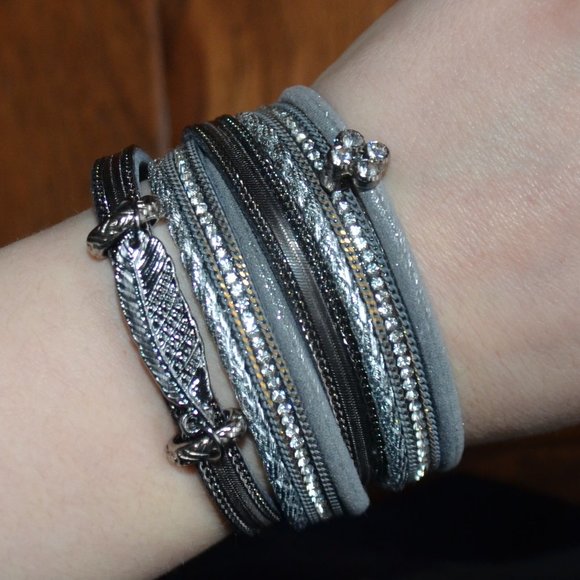 Gray/Silver Cuff Wrap Bracelet with Feather Detail