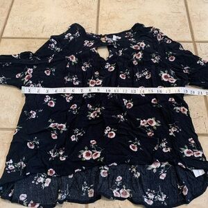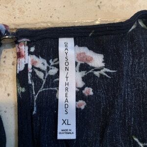 This is a beautiful long-sleeved floral blouse from Grayson Threads, size XL. The top features a flattering keyhole detail at the neckline and a button closure at the back of the neck. The sleeves have a flared, bell-sleeve cuff. Made from 100% Rayon, this blouse is lightweight and flowy, perfect for a boho or romantic look. Made in Guatemala.