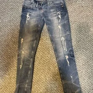 These jeans are nicely distressed. Just enough. Soft denim and straight legs. 27" waist, 29" inseam and 38" Long