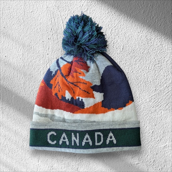 Made in Canada, Great Northern toque with pretty fall leaf design and pompom.