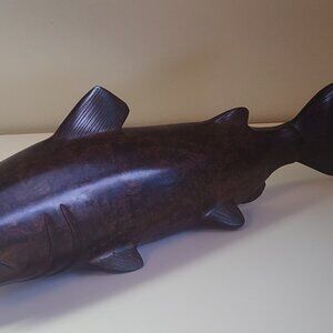 Style/Craftsmanship: The carving is detailed, especially in the fins, gills, and around the eye, but the body is smoothed and polished to highlight the wood's natural grain. This suggests it is a high-quality, artisanal piece, perhaps a piece of folk art, a decorative item for a study or cabin, or even a piece of functional art like a handle or ornament (though it looks purely decorative).