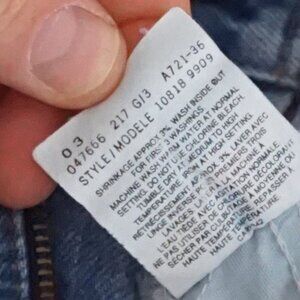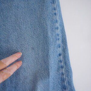 Crafted in cotton denim, the fabric offers durability while still having that softened, broken-in appeal. The straight-leg silhouette makes styling easy — pair them with a chunky knit, a vintage crewneck, or a crisp Oxford for a more Collegiate take. Their light blue tone works with everything from flannels to neutral outerwear, giving them year-round versatility. There is a small flaw on the leg, shown where a finger points in the photo, but it blends into the wash and adds to the authentic worn-in look collectors love.
