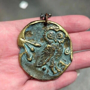 Athena or Perseus owl necklace handmade and reproduced in antiqued brass (bronze?) from an ancient Greek coin.