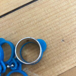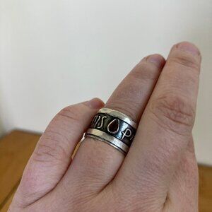 Vintage wide silver band ring has Greek lettering for "Philotes" around the band with small teardrop shaped garnet stone on the top. Inside of band is stamped "925". Purchased from the "Past Times" catalog in the 90s. US ring size 6, width of band is 1/2". Good pre-owned condition.