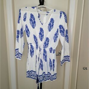 White & Royal Blue Palmette print Long Sleeve Vneck Romper Onesie with blue fringe Tassle Waist Ties.