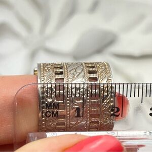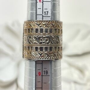 Gold Wash Silver tone Ring has a Reverse set crystal stone that changes colours between Green to Amber. Beautiful Ring has some of the gold tone worn off. This doesn’t take away from the style and charm. Band is 2 cm thick with flower etching and cutout pattern.