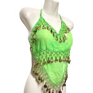 Green Belly Dancing Top Crocheted with Gold Beads Coins Halter Crop Top
