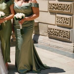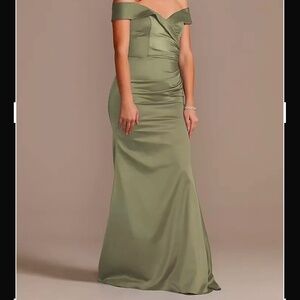 This gorgeous satin off-the-shoulder mermaid bridesmaid dress from David's Bridal is the perfect any season. The off-the-shoulder neckline adds a touch of elegance, while the mermaid silhouette is flattering on all body types. The satin fabric drapes beautifully and has a luxurious feel. Whether you're a bridesmaid or a guest at a formal event, this dress is sure to turn heads. This stretch-satin mermaid bridesmaid dress features an off-the-shoulder sweetheart neckline, flattering side-ruching, back buttons, and a fishtail train.