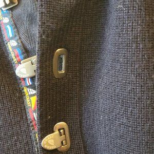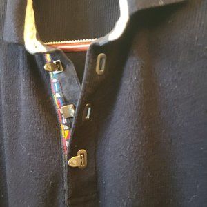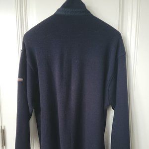 Green Coast, VGUC, Size 58 or XL, Made in Italy, Navy Blue, Merino Wool Blend Sweater, with branded foldover lock clasp closure in a satin silver metal hardware finish, with branding on sleeve as well as collar opening. Some pilling on the front and minor pilling along sleeves. Only visible in brighter light. This is a gorgeous sweater with weight to it, has similarities to the Paul and Shark sweaters. Their current line of sweaters are around the $400 price range.