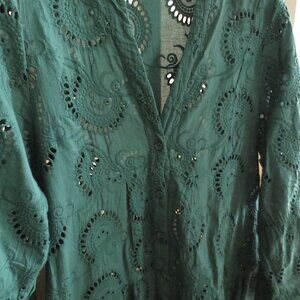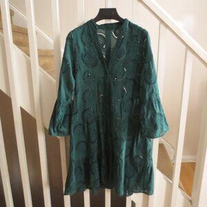 Green Cotton Tiered Eyelet Summer Mini Midi Dress with Long Flared Sleeves