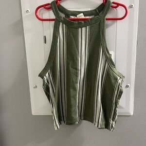 This green sleeveless tank top features a trendy cropped silhouette and stylish cut out details. The design is complemented by vertical white stripes that add a modern touch, making it perfect for casual wear. Crafted from soft fabric, it ensures comfort and breathability throughout the day.