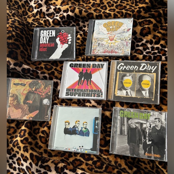 Collection of Green Day CDs featuring various album covers.