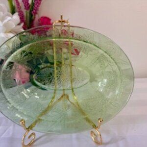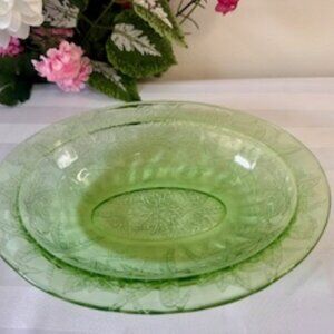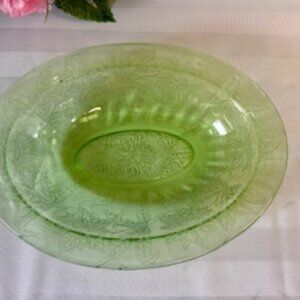 This lovely green depression glass bowl features an elegant etched floral design, scalloped rim, and a classic oval shape. A beautiful piece of 1930s–1940s glassware, it brings vintage charm to any table or display shelf.