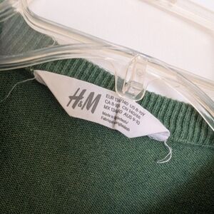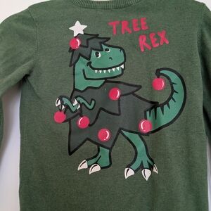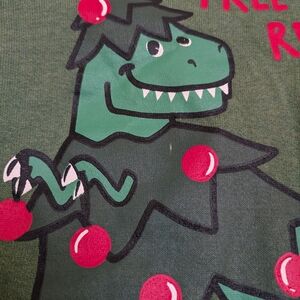 Fun green sweater with a dinosaur Christmas design. Features 'Tree Rex' text and festive decorations.