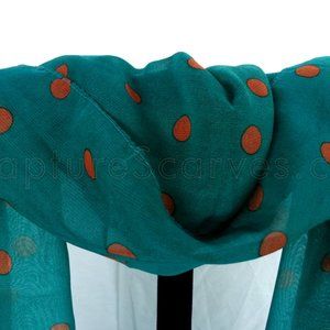 This is the green version my “Dotty” polka dot scarf. Tan dots on green chiffon fabric. This is the green version; several other are available at the time of listing.