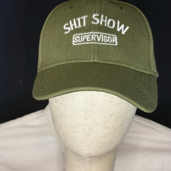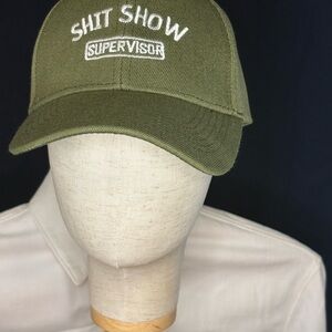 Olive green embroidered hat with humorous “Shit Show Supervisor” text on the front. Classic curved brim baseball cap with adjustable strap in the back for a comfortable fit. Great casual accessory or gag gift for work, events, or everyday wear.