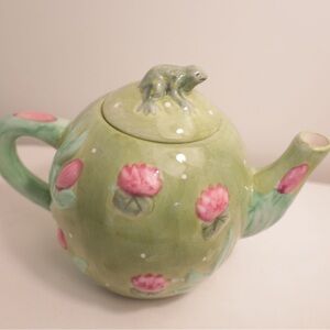 Charming green ceramic teapot featuring a delightful frog lid and pink floral accents. Perfect for adding a whimsical touch to your tea time.