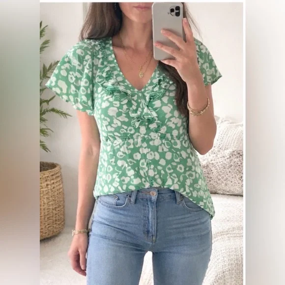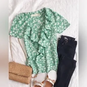 Green Floral Ruffle V-Neck Top