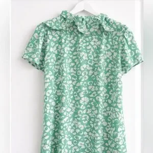 Style: Ruffle front, short sleeve