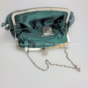 Green Satin Clutch Purse with three Floral ribbon twirls embedded with crystal rhinestone