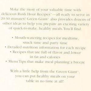 Green Giant Recipe Hardcover Book: Rush Hour Recipes & Quick Dinner Ideas. The book is used but in excellent condition. 1995 The Pillsbury Company