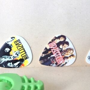 Green guitar pick holder with assorted band picks. Perfect for music enthusiasts.