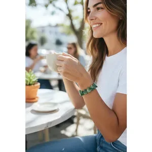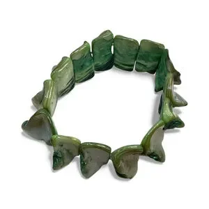 This stunning bracelet features a collection of glossy, shell-inspired pieces in varying shades of green and pearlescent tones. Crafted in a stretch-fit design for comfort and versatility, it adds a touch of natural beauty to any outfit. Perfect for both casual looks and elegant occasions, this bracelet is a unique statement accessory that catches the light beautifully.