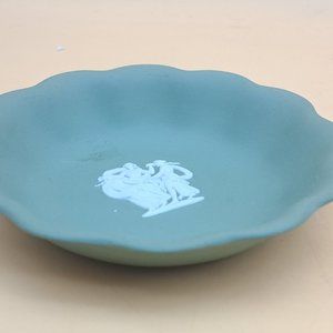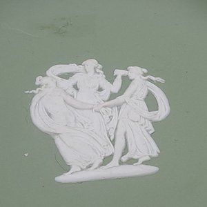 A green ashtray embossed with a design of 3 dancers in an ancient Greek style in cold porcelain; it was made by Wedgwood in England as part of their Jasperware line. On the underside in pen is written "Mrs Zang 1964." There is wear as in the pictures and the ashtray is 5 3/8" across and it stands a little under an inch tall.