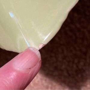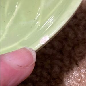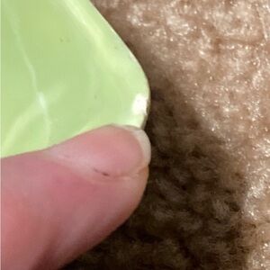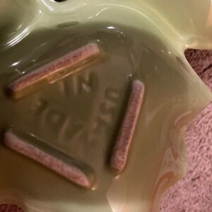 This dish/plate is in good vintage shape. There are a few nicks on it, noted in the pictures. It is a very nice green colour. Great for Christmas candy or baking