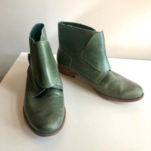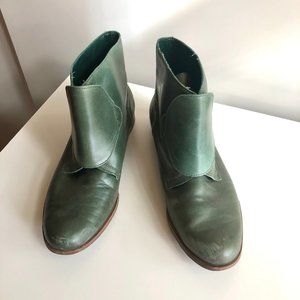 Very cool and unique ankle boots - green leather uppers with tan leather sole, monk strap buckle. Marked size 41, could fit size 10.5-11.