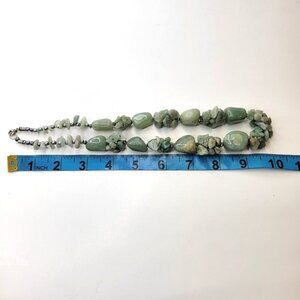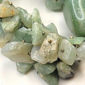 More of a light sage green with tan hues with varying sizes of large beads and green chips interspersed with silver tone beads