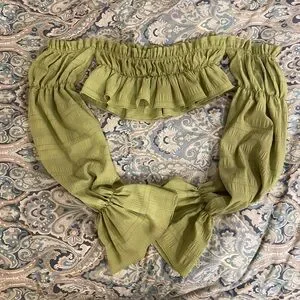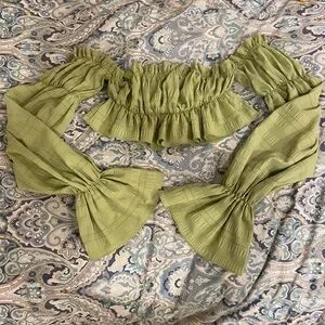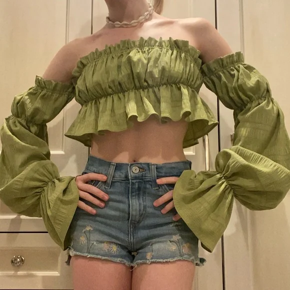 Stunning lime green off-shoulder top with ruffle detail and billowing sleeves