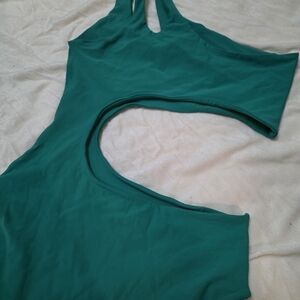 Keywords: one shoulder swimsuit, cutout swimwear, green monokini, trendy one piece, vacation outfit, summer swim style