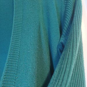 This open-front waterfall cardigan in a beautiful forest green is longer in the front than it is in the back, and features three different knit styles for a unique look. This garment is well-loved and priced to reflect.