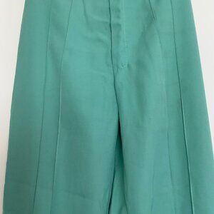 Stylish simple elegance green pants with 2 rib design from waist to end of pant leg on both sides. Front zipper. Waist 26 inches. Length of leg from waist to end is 40 inches. Waist to crotch is 12 inches. Circumference around stomach area is 36 inches. Made in USA. Material is Polyester.